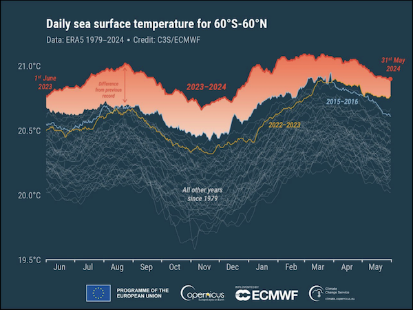 La température mondiale des océans avoisine 21°C, proche du record absolu (21,1°C). L'Atlantique Nord atteint 24,5°C, avec une canicule persistante, depuis fin mai, dans le golfe de Gascogne et au large du Portugal.